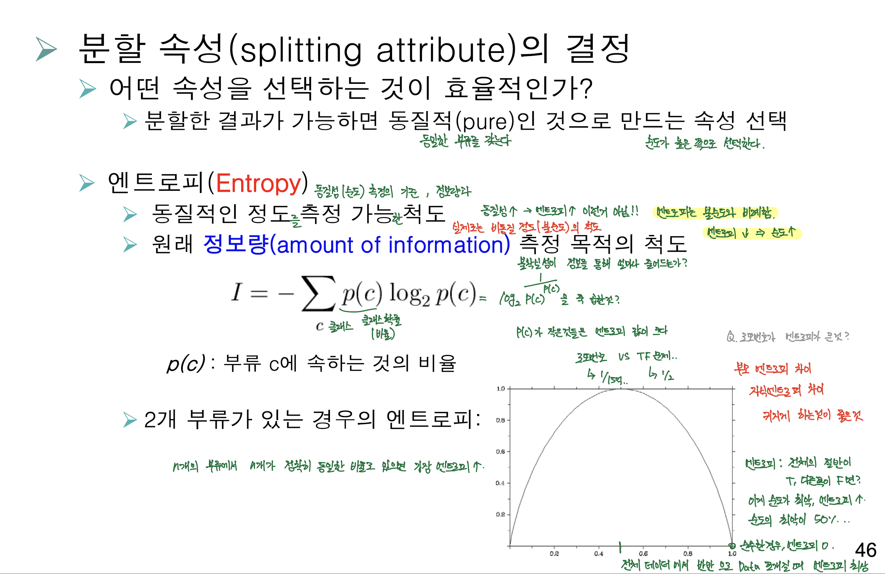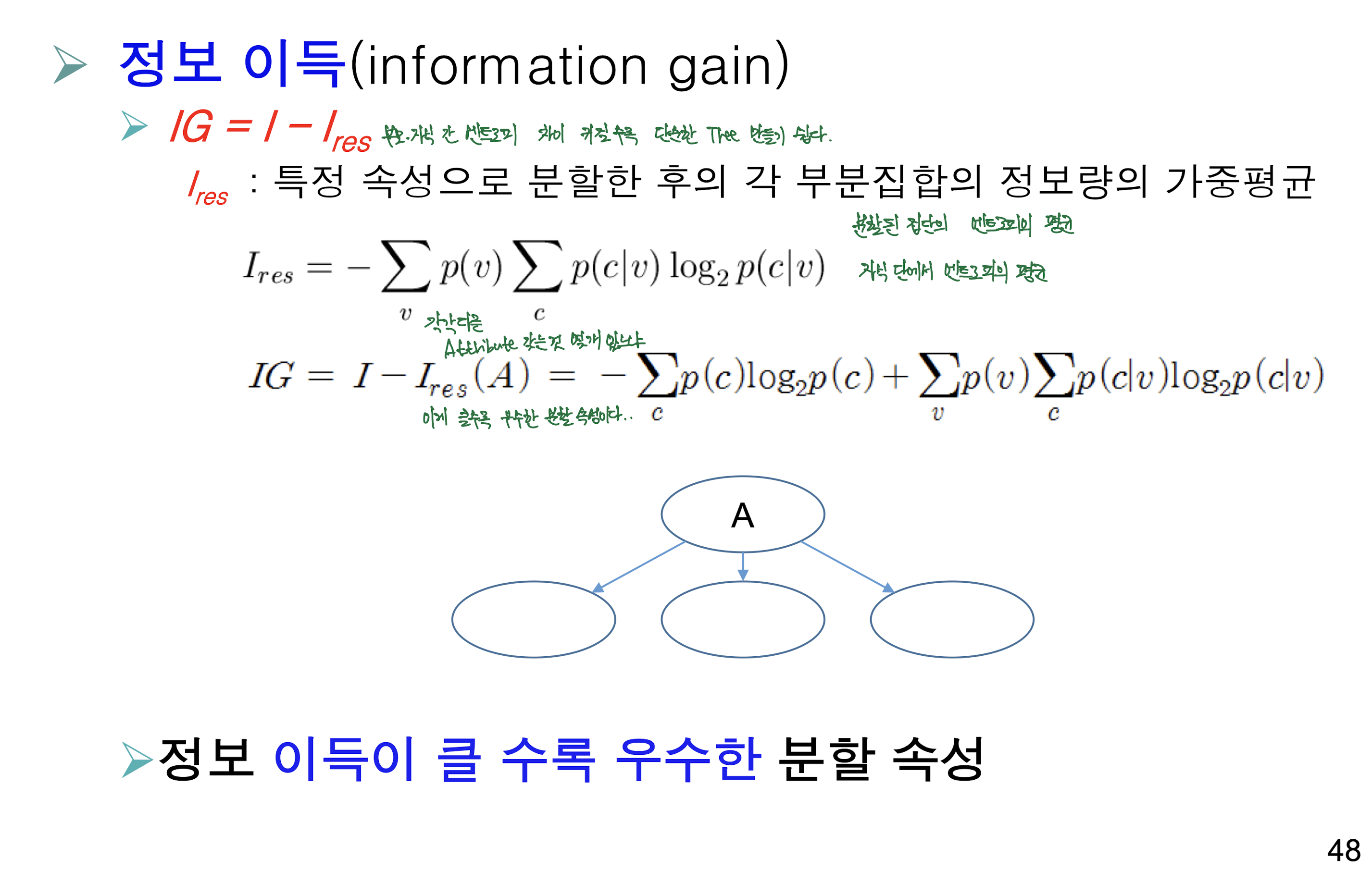 그래서, 엔트로피가 낮은 분할 속성을 선택하는 것이 우수한 것이죠.