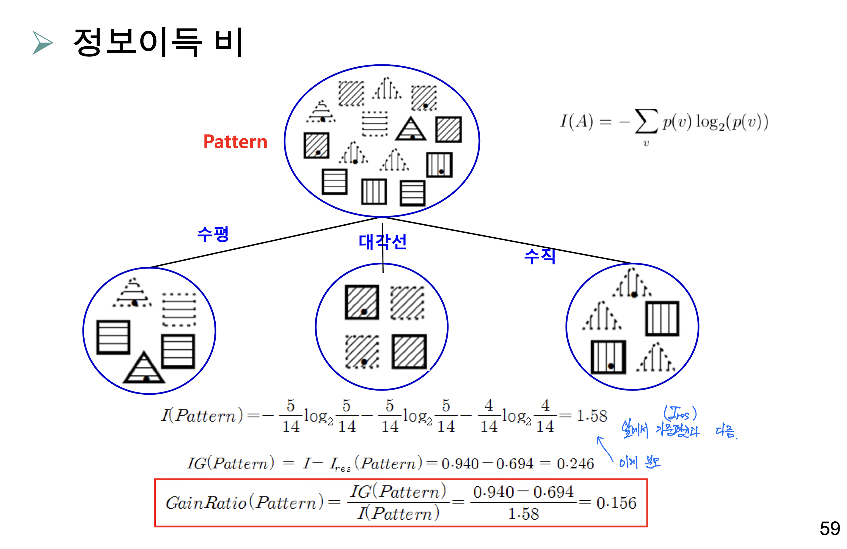 여기서 I(Pattern)는, 속성값(패턴)을 부류로 간주하여 계산한 엔트로피로, 속성값이 많아질 수록 그 값이 커지구요