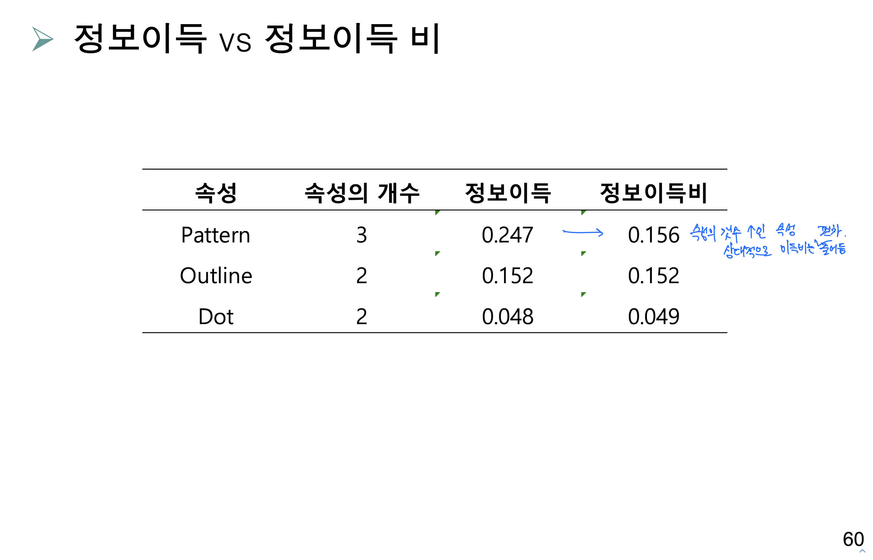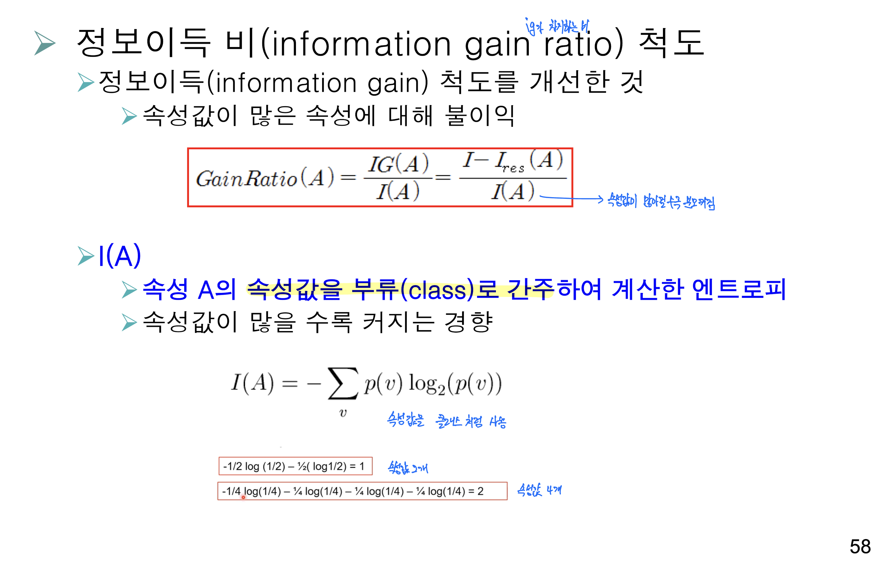 그래서 그 개선책으로, 정보이득비(IG ratio) 척도라는 것이 있고, 지니 지수(Gini index)라는 척도가 있는데요,
