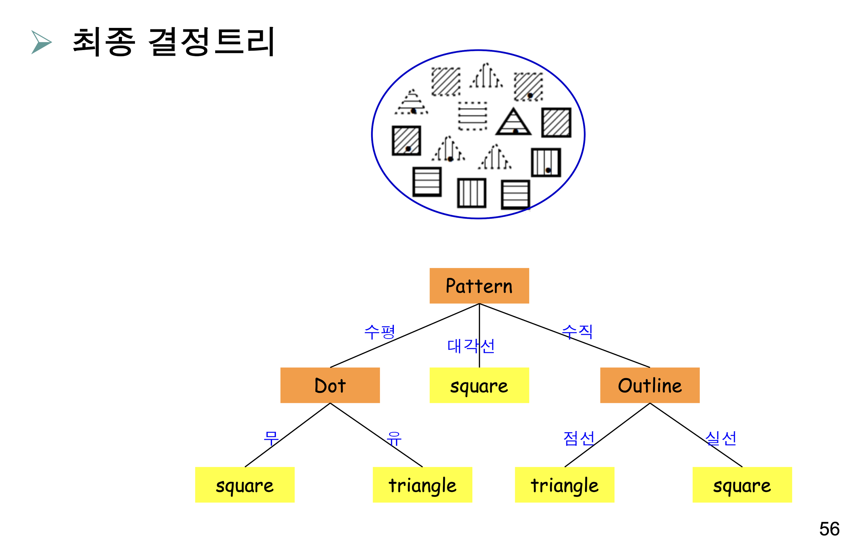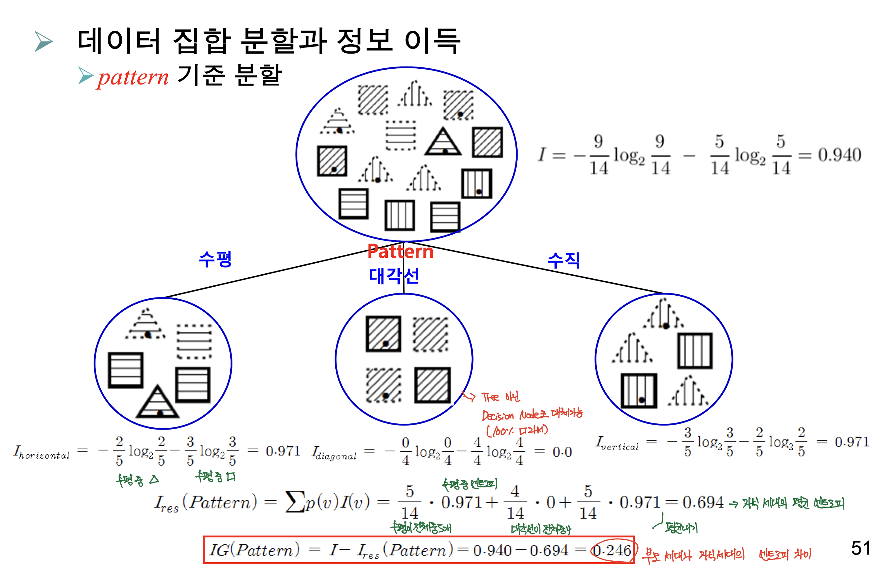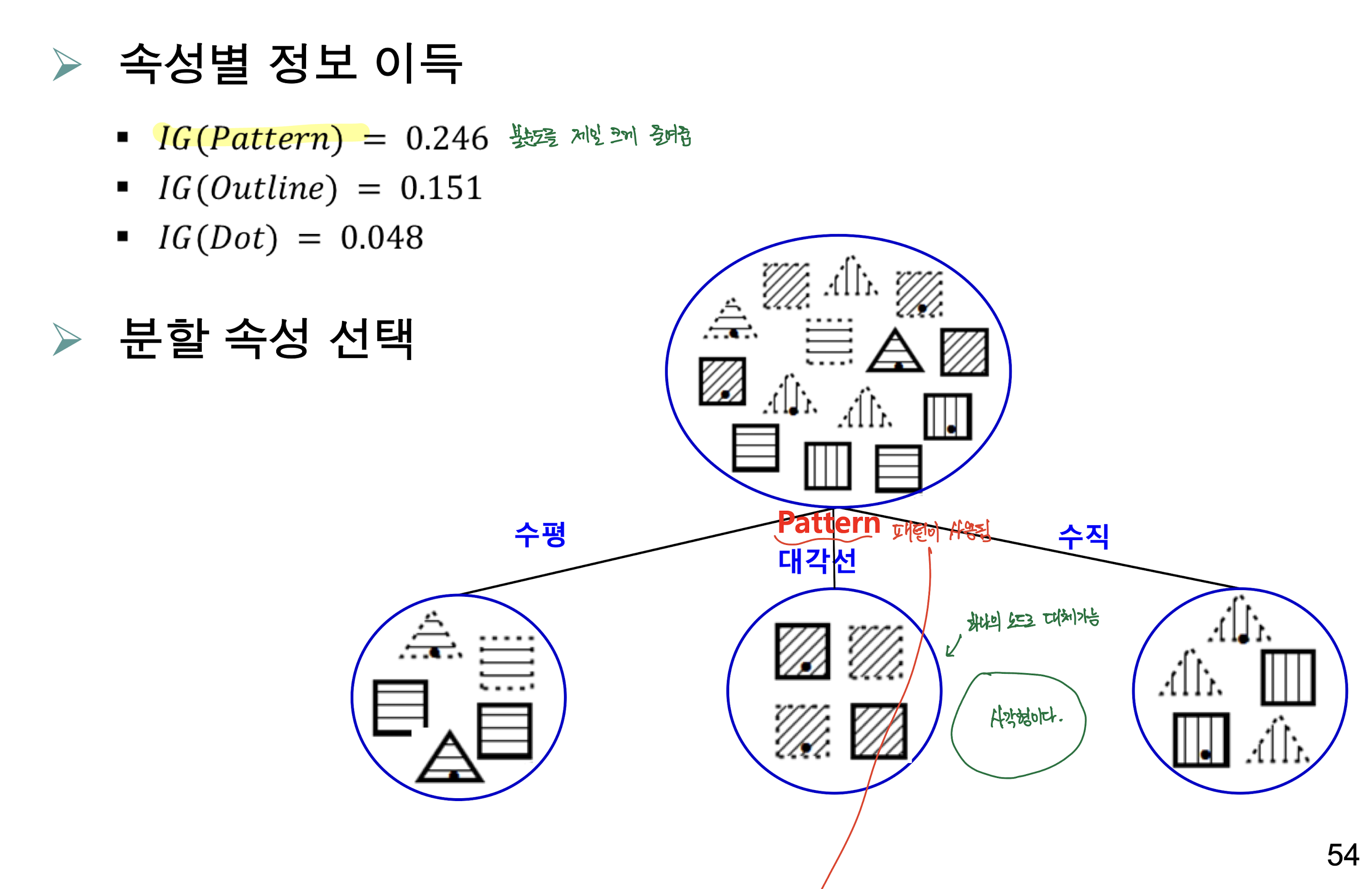 패턴 속성을 기준으로 나누는 것이 IG가 가장 크니까, 첫번째 서브트리를 생성할 떄는 패턴을 기준으로 하고